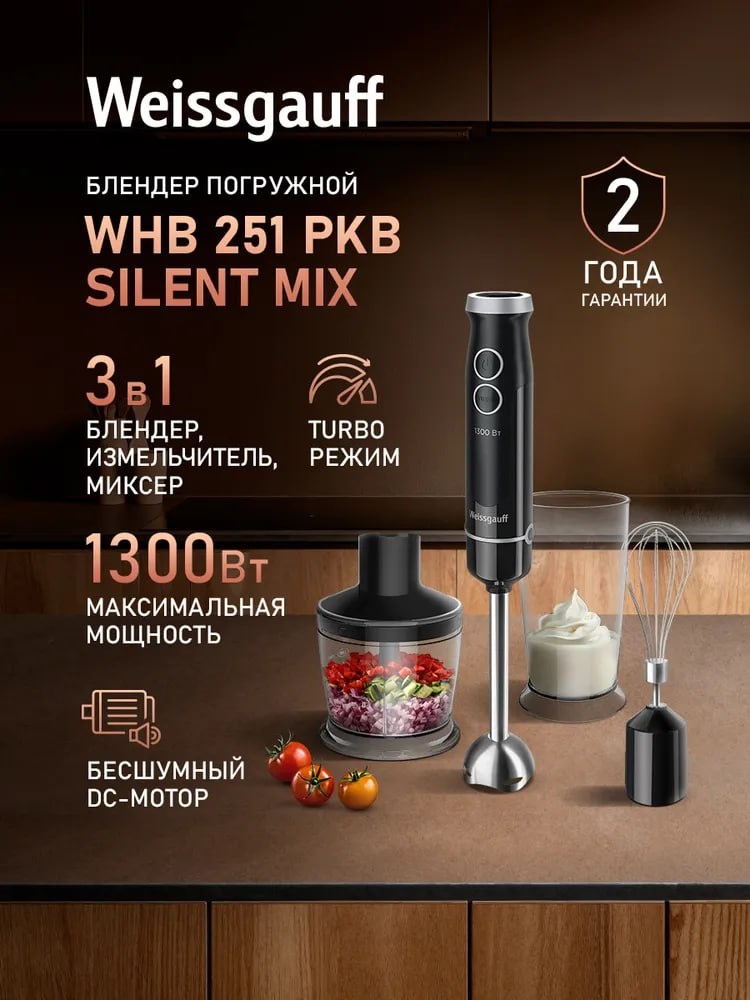 Погружной блендер Weissgauff WHB 251 PKB Silent Mix 3 в 1: Блендер, Миксер, Измельчитель