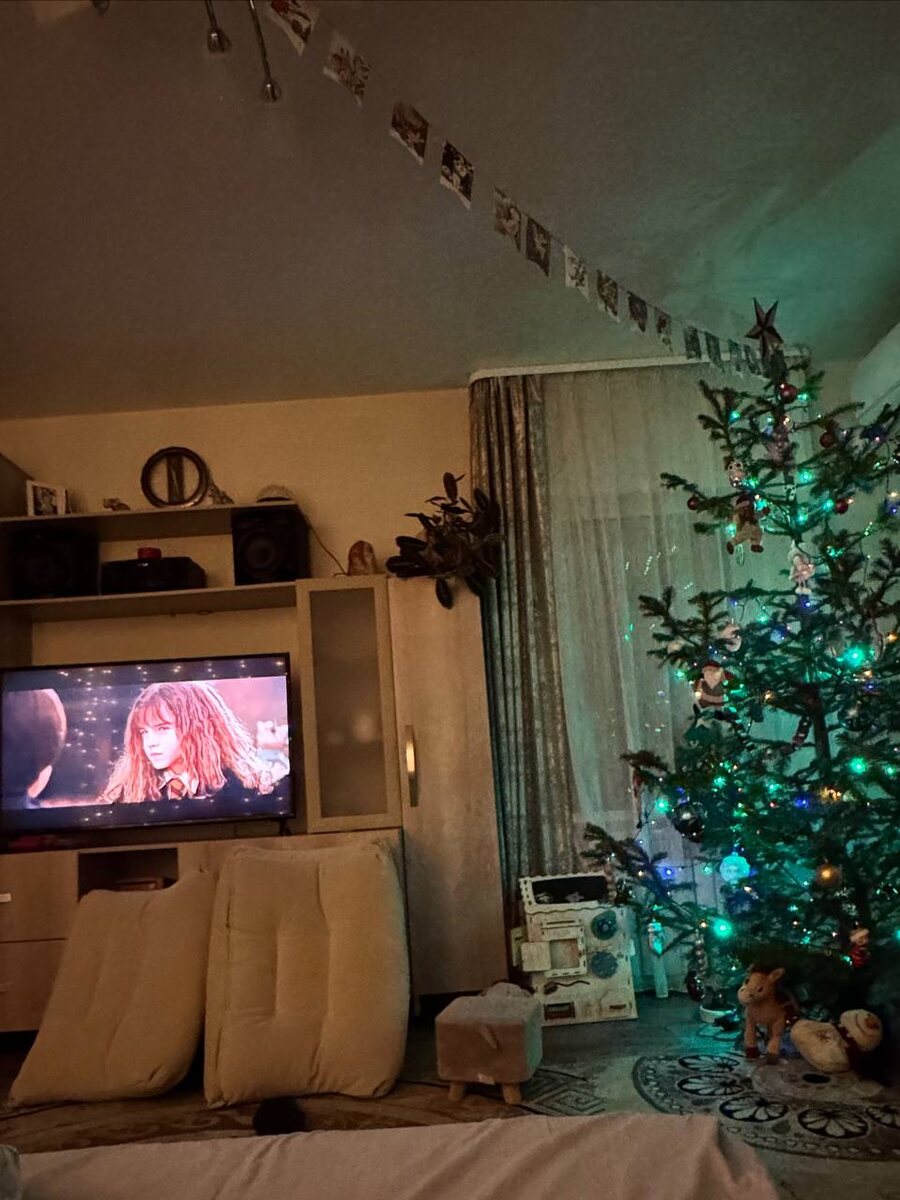 Новогоднее настроение - это ночами смотреть Гарри Поттера под свет гирлянд на елке🎄