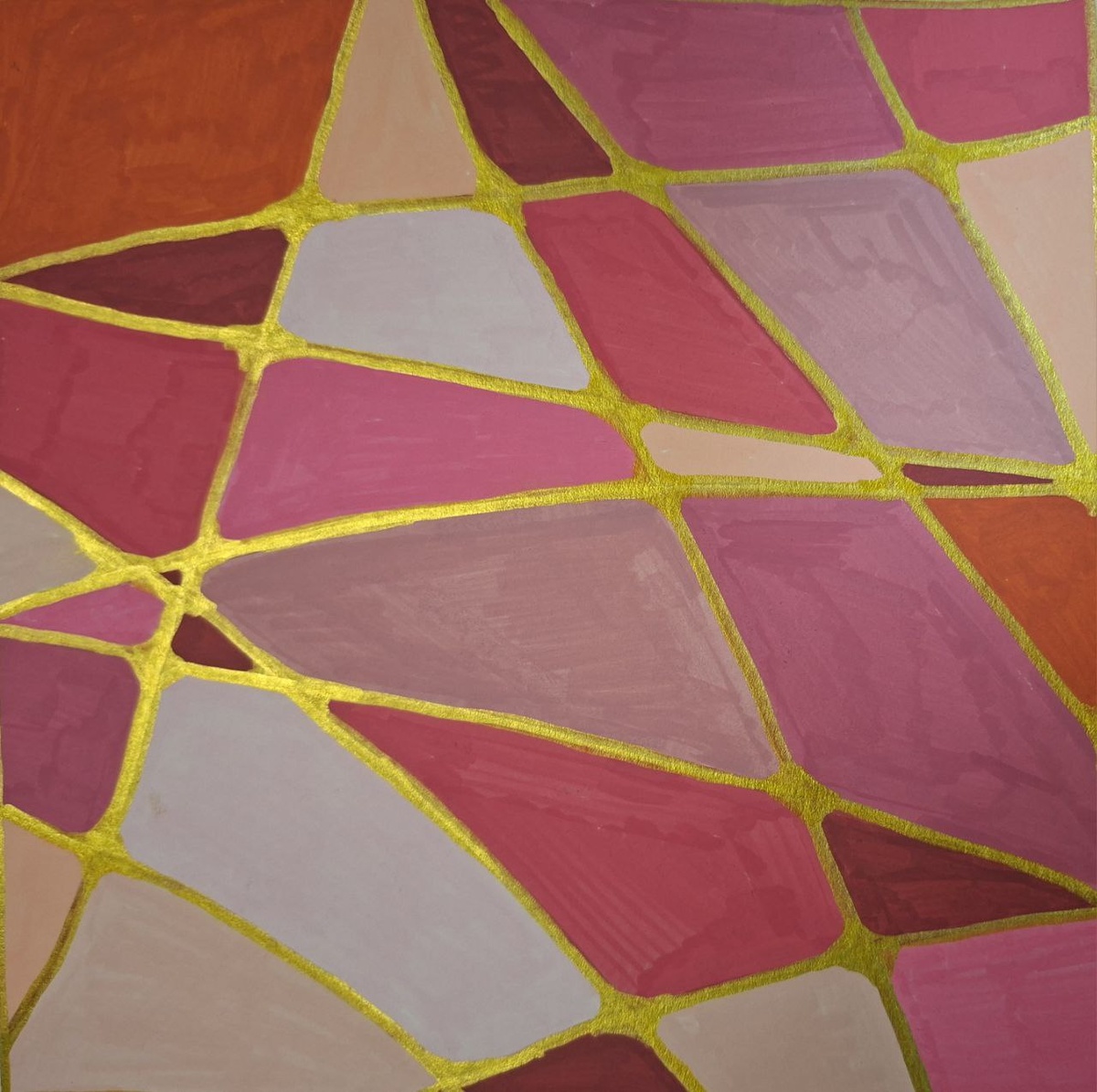 Иногда хочется взять кисть и забыть о чётких линиях и правилах. Так и рождаются абстрактные картины: без строгих границ, но с особым настроением и даже историей. Сегодня хочу рассказать о своей работе, где главную роль играют оттенки розового и золотой контур. Я часто вдохновляюсь окружающим миром: отражением окон в лужах, трещинами на тротуаре, необычным узором на кафеле. Однажды мне попались в руки красивые кусочки цветного стекла — так появилась идея соединить мягкие розово-персиковые оттенки в одну мозаику. В работе использовано несколько тонов розового — от тёплого терракотового до нежно-пудрового. Я хотела, чтобы на картине было ощущение нежности, женственности, но в то же время динамики. Золотой контур добавляет света и яркости — особенно, когда работа стоит у окна и попадает солнечный луч. Для меня абстракция — это всегда импровизация. Сначала были просто пятна, затем они выстраивались в знакомый мотив мозаики. Я выбирала цвета интуитивно, а золотую краску наносила самой тонкой
