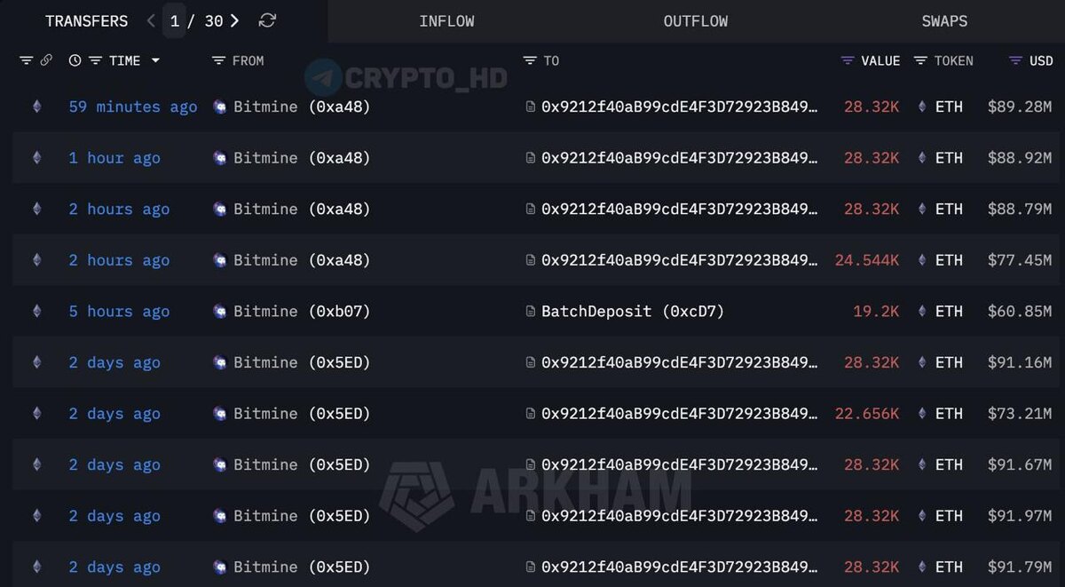 2️⃣ #ETH Компания BitMine отправила в стейкинг еще 128,704 ETH ($405m
