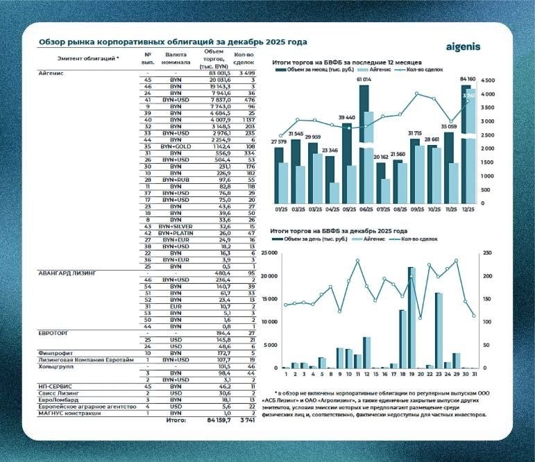 ОБЗОР РЫНКА КОРПОРАТИВНЫХ ОБЛИГАЦИЙ ЗА ДЕКАБРЬ 2025 ГОДА В декабре 2025 года объем торгов корпоративными облигациями* на Белорусской валютно-фондовой бирже составил 84,160 млн рублей, в 2,4 раза превысив ноябрьский показатель. Инвестиционная активность в части количества сделок также выросла: за месяц была заключена 3 741 сделка – на 25% больше, чем месяцем ранее. В обращении находилось 48 выпусков корпоративных облигаций, представленных 11 эмитентами. * в обзор не включены корпоративные облигации по регулярным выпускам ООО «АСБ Лизинг» и ОАО «Агролизинг», а также единичные закрытые выпуски других эмитентов, условия эмиссии которых не предполагают размещение среди физических лиц и которые недоступны для частных инвесторов. @invest_by