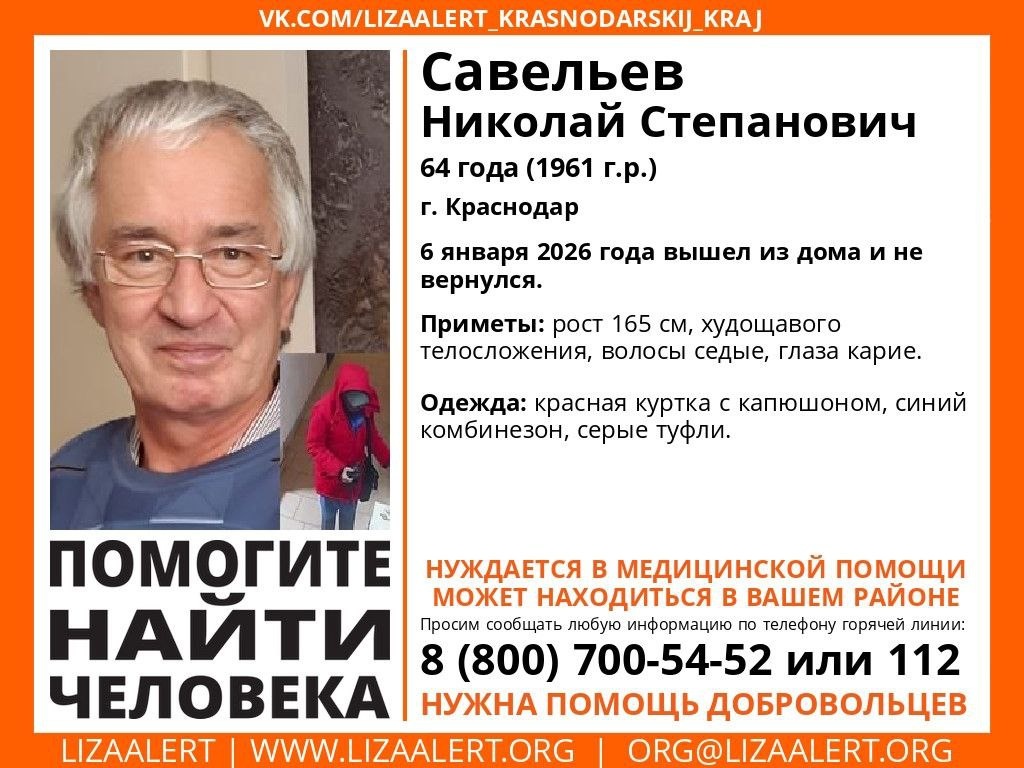 В Краснодаре к 8 января вторые сутки разыскивают без вести пропавшего 64-летнего Николая Савельева. По данным добровольцев поисково-спасательного отряда «ЛизаАлерт» Краснодарского края, 64-летний Николай Степанович Савельев пропал в Краснодаре 6 января 2026 года. В тот день он вышел из дома и не вернулся. Приметы: рост 165 см, худощавого телосложения, волосы седые, глаза карие. Был одет: красная куртка с капюшоном, синий комбинезон, серые туфли. Мужчина нуждается в медицинской помощи. Может находиться в любом районе Краснодара и края. Горячая линия отряда: 8 800 700 5452 (звонок бесплатный).