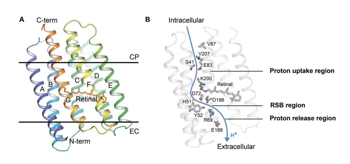 Исследователи МФТИ с коллегами раскрыли механизм работы ключевого для океанской жизни мембранного белка — протеородопсина, который выполняет роль светозависимого протонного насоса. В отличие от хорошо изученных родопсинов животных, этот белок у морских бактерий использует энергию света для активного перекачивания протонов через клеточную мембрану, создавая ионный дисбаланс, необходимый для производства энергии (АТФ). Учёные смогли получить высокодетальные структуры белка на разных стадиях его фотоцикла, что ранее не удавалось. Это позволило увидеть, как связанная с белком молекула ретиналя поглощает фотон, меняет форму и запускает точно скоординированные перемещения ключевых аминокислот и молекул воды, открывая и закрывая путь для протонов. Открытие проясняет основы энергетики морских микроорганизмов, формирующих основу пищевых цепочек океана, и вносит важный вклад в фундаментальное понимание мембранного транспорта. ПромТех