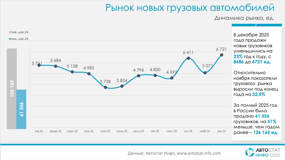 По данным «Автостат Инфо», 2025 год стал для рынка новых грузовых автомобилей в России годом жесткой коррекции: продажи сократились с 126 165 до 61 556 единиц, то есть ровно на 51%. При этом конец года выглядит контрастно: в декабре рынок прибавил 32,5% к ноябрю (с 5 071 до 6 721 грузовика), но при сравнении с декабрем 2024-го остается просадка на 23% - тогда было реализовано 8 686 машин. Годовая кривая показывает классический «съезд с плато». После относительно ровного начала года на уровне 5,1–5,8 тыс. машин в месяц рынок в мае проваливается до 3,7 тыс., затем с небольшими колебаниями поднимается к осеннему пику: в октябре виден рывок до 6 411 единиц, но закрепиться на этом уровне не удается. Декабрьский всплеск продаж, по мнению аналитиков «Автостат Инфо», это скорее отложенный спрос и «добивание» оставшихся лимитов бюджетов, чем разворот тренда: в абсолютных величинах рынок всё равно заметно меньше прошлогоднего. Структура по маркам подчеркивает, что падение носит неравномерный х