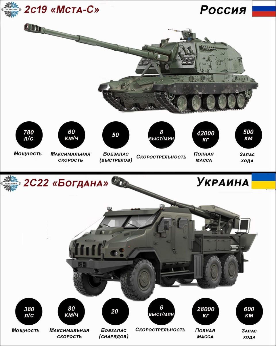 " Представляем вашему вниманию сравнительную инфографику разноплановых самоходных гаубиц ⚠️ Ключевые преимущества: ► 2С19 «Мста-С»: 🔵Защищенность: полноценное бронирование башни защищает расчет от осколков и стрелкового оружия, что позволяет работать ближе к линии фронта 🔵Огневой шквал: благодаря автоматизированной системе заряжания, «Мста-С» превосходит «Богдану» в темпе стрельбы на коротких промежутках времени 🔵Проходимость: гусеничное шасси обеспечивает лучшую маневренность на мягких грунтах и бездорожье по сравнению с колесными платформами ► 2С22 «Богдана»: 🔵Дальность и калибр: 155-мм стандарт НАТО и ствол длиной 52 калибра дают преимущество в дальности 🔵Мобильность: колесное шасси позволяет быстро менять позиции, но только по дорогам общего пользования 🔵Точность: использование высокоточных боеприпасов (например, M982 Excalibur) делает её снайперским инструментом артиллерии ► «Мста-С» лучше подходит для интенсивных боев на линии фронта, где важна бронезащита и способно