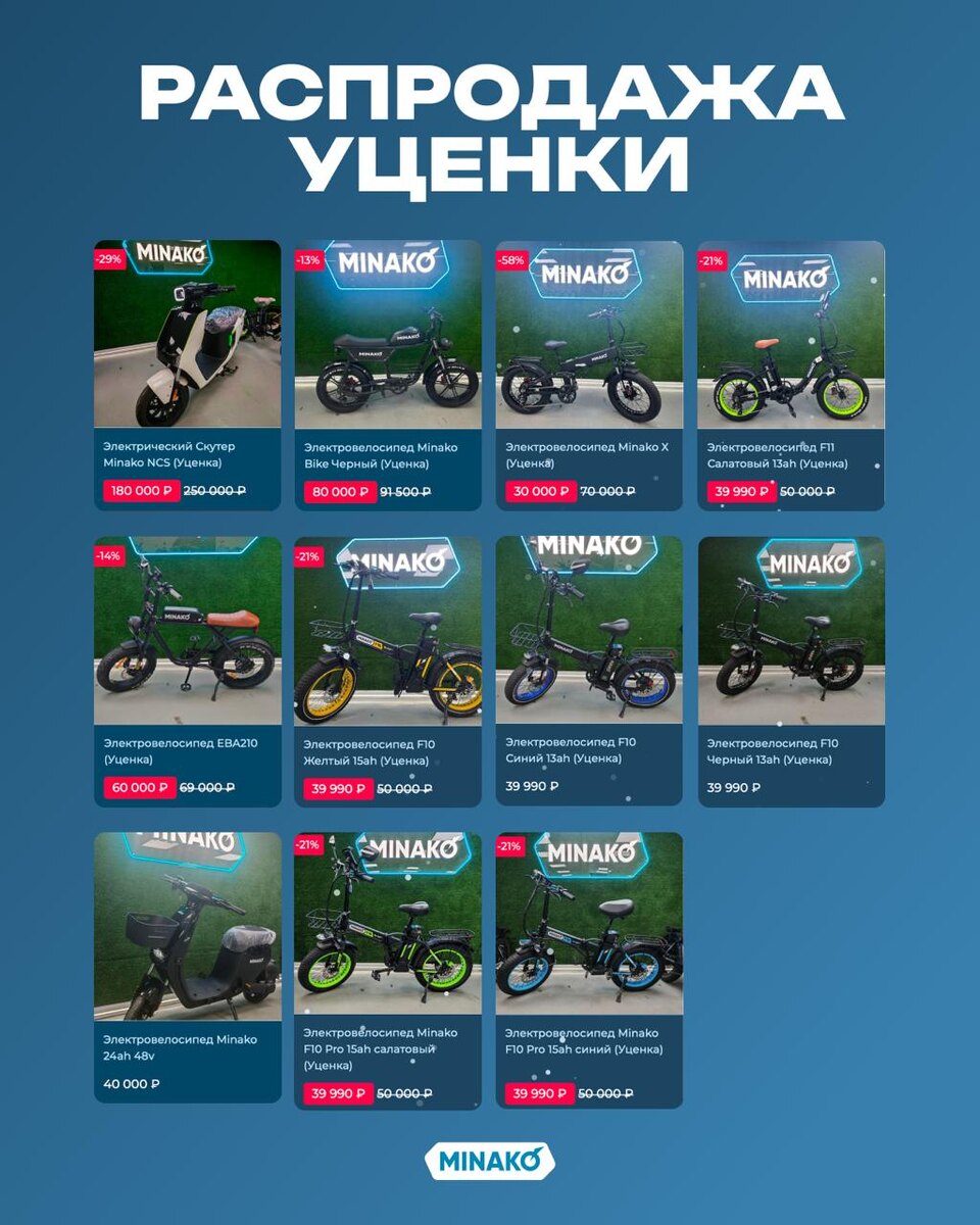 В разделе уценки собраны полностью исправные модели MINAKO. Причины снижения цены простые: отсутствие коробки, замена отдельных компонентов или небольшие внешние нюансы. 📦 В наличии в уценке: •Электрический скутер Minako NCS • Электровелосипед Minako Bike (чёрный) • Электровелосипед Minako X • Электровелосипед F11 (салатовый) • Электровелосипед EBA210 • Электровелосипед F10 — жёлтый 15Ah / синий 13Ah / чёрный 13Ah • Электровелосипед Minako 48V 24Ah • Электровелосипед Minako F10 Pro — салатовый 15Ah / синий 15Ah 🛠 Техническое состояние проверено — все нюансы указаны в карточках товаров. Электровелосипеды MINAKO ⚡️