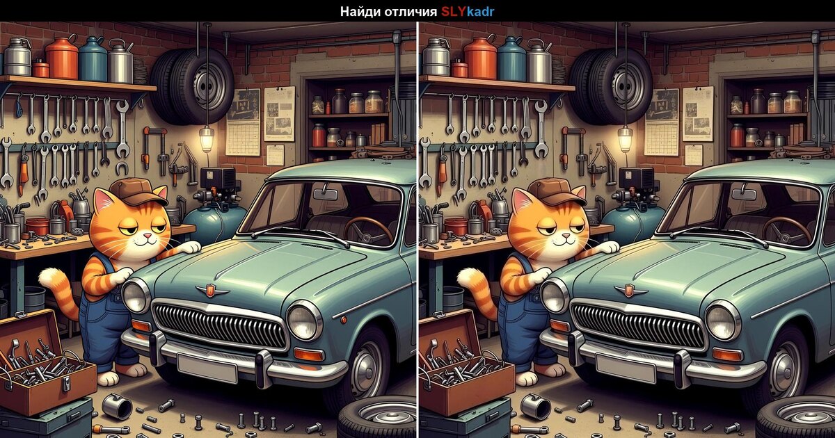 Привет, друзья! Канал "Хитрый кадр" рад приветствовать вас в новом увлекательном задании! Сегодня у нас для вас уникальная картинка с котом-механиком, который занят ремонтом автомобиля. Но на этом не все — на картинке скрыто несколько отличий, и ваша задача — найти их все! Включайте внимание, ловкость и терпение! Отлично справились! А если нашли все отличия — поздравляем, вы настоящий мастер внимательности! Поделитесь этим заданием с друзьями, пусть они тоже попробуют себя. Подписывайтесь на наш канал "Хитрый кадр", чтобы не пропустить новые головоломки и развлечения. До встречи в следующем кадре! Ниже отгадка. 🚘