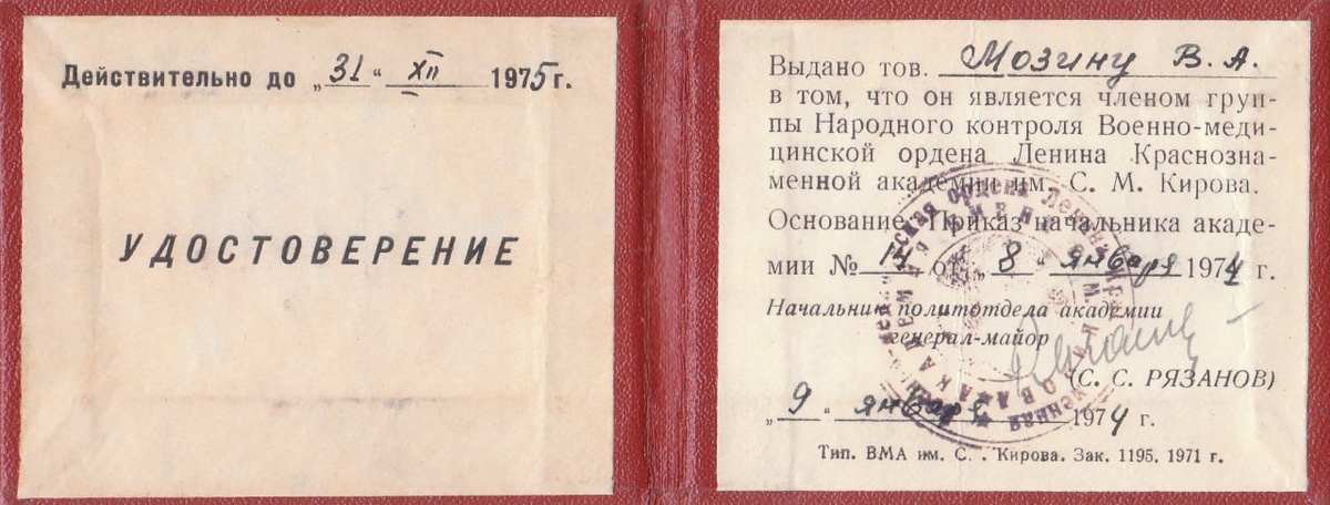 Удостоверение выданное Мозину В.А., что он является членом группы народного контроля Военно-медицинской академии имени С.М. Кирова. Источник: отсканированное удостоверение из личной коллекции. #документ #удостоверение #ВМедА #Ленинград