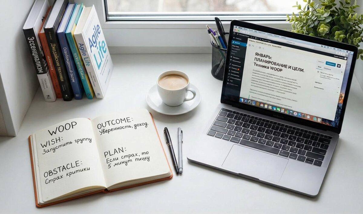 Наверняка вы сталкивались с парадоксом: чем красочнее мы визуализируем успех (прекрасные отношения, дом мечты, путешествия и т.д.), тем... меньше энергии остается на реальные действия. Мозг, получив порцию дофамина от фантазии, считает, что дело уже сделано, и расслабляется. Сегодня разбираем технику WOOP, разработанную профессором психологии Габриэль Эттинген. Это научно обоснованный способ превратить аморфные мечты в конкретные действия, используя механизм ментального контрастирования. Это отличный инструмент для анализа собственных планов на год. 💻Алгоритм WOOP (4 шага) Самое важное: процесс занимает всего 5–10 минут, но требует усердия. 1. W — Wish (Желание) Сформулируйте цель, которая для вас важна, но при этом сложна. Она должна быть реалистичной и ограниченной во времени (например, на ближайший месяц). ❌ Не подходит: «Стать гуру /специалистом/профи». ✅ Подходит: «сходить на обучение и получить навык» или «сделать рекомендуемую практику для оттачивания навыка». 2. O — Outcom
