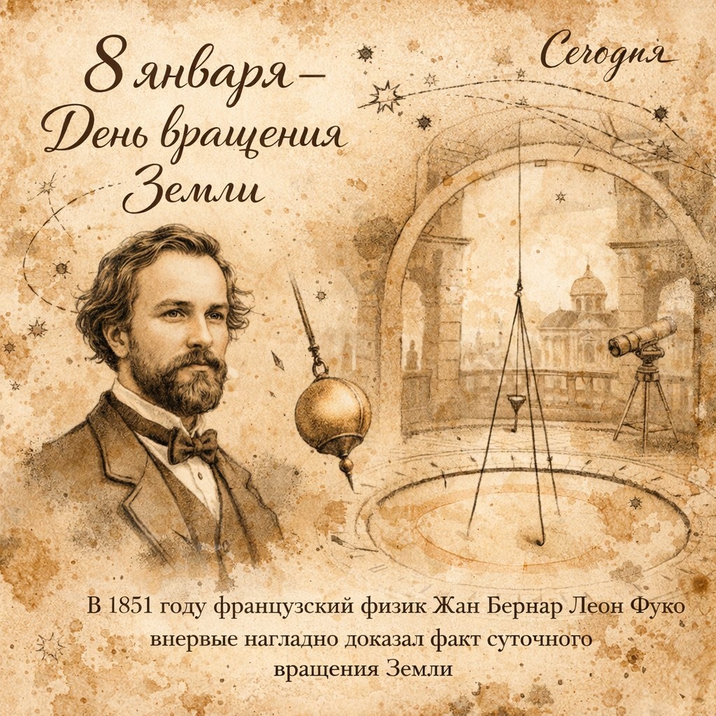 8 января — необычная дата в научном календаре. В этот день вспоминают событие, которое навсегда изменило представление людей о нашей планете: в 1851 году французский физик Жан Бернар Леон Фуко впервые наглядно доказал факт суточного вращения Земли. К середине XIX века учёные уже предполагали, что Земля вращается вокруг своей оси, но доказательства были косвенными — они основывались на астрономических наблюдениях и сложных расчётах. Не хватало простого и наглядного эксперимента, который мог бы убедить даже скептиков. 8 января 1851 года Фуко провёл первый опыт в подвале своего дома в Париже. Он сконструировал маятник: пятикилограммовый латунный шар, подвешенный на стальной проволоке длиной 2 метра. Когда учёный качнул шар, через некоторое время стало заметно: плоскость качания повернулась на несколько градусов — хотя никаких внешних воздействий не было. Вывод был однозначен: маятник зафиксировал вращение Земли вокруг своей оси. Уже 3 февраля 1851 года Фуко повторил эксперимент в Парижск