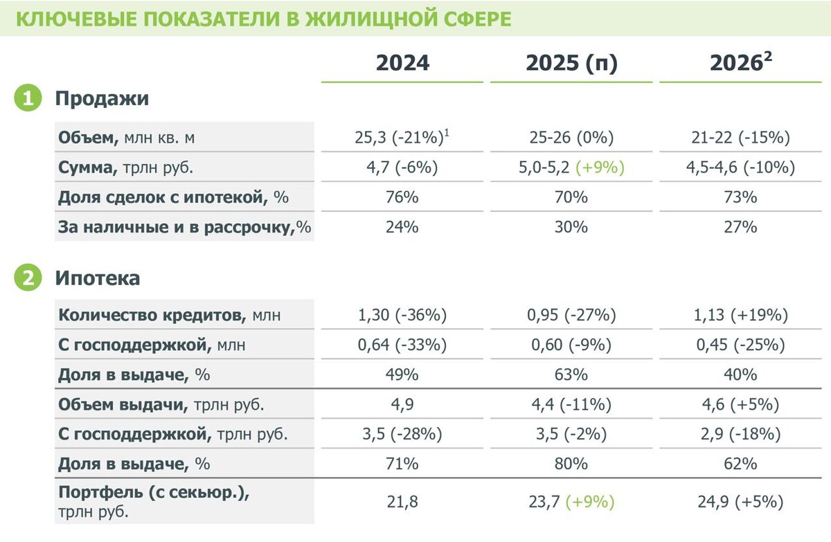 Данные от «Дом РФ» В 2025 году, несмотря на более сложные, чем в 2024-м, рыночные условия, объем продаж у застройщиков превысил показатель прошлого года — продано 25-26 млн кв. м жилья на сумму 5-5,2 трлн руб. (против 4,7 трлн руб. в 2024 году). Многие думали, что без массовой господдержки продажи рухнут, но нет. Адаптироваться рынку помогли рассрочки, семейная ипотека и начавшийся рост выдач рыночной ипотеки. А за счет повышения цен на квартиры застройщики вообще вышли в плюс. В 2026 году из-за ограничения семейки ожидается сокращение продаж на 15% в объеме и на 10% в деньгах (за счет дальнейшего роста цен). Решающее влияние на рынок окажет скорость снижения ключевой ставки — она определит динамику ставок по проектному финансированию и спрос на рыночную ипотеку. Ключевые риски — оплата гражданами накопленной рассрочки (1,4 трлн руб.) и обслуживание застройщиками кредитов по ставкам ПФ 16% и выше — пятая часть всей задолженности. Еще больше новостей, аналитики и разборов рынка недвижим