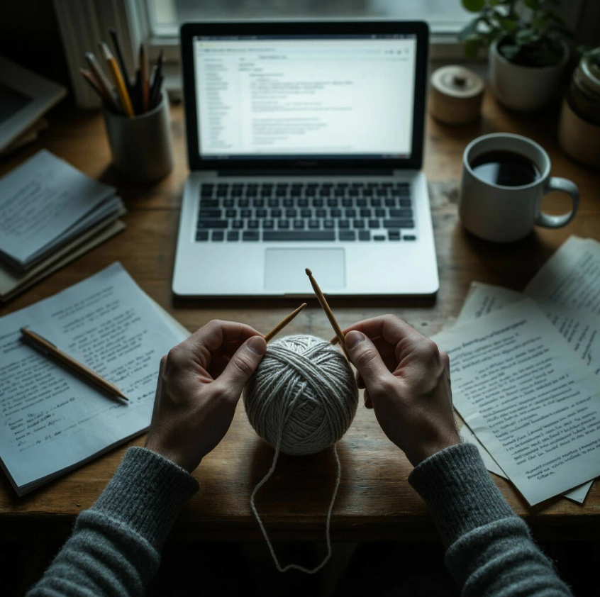 Вязание — это медитация для тех, кто не умеет медитировать. Руки заняты, голова свободна. В ней вдруг начинают прорастать решения, о которых ты и не думал. Сюжетные ходы для сценария, удачная метафора для текста. Они приходят не из напряжённого стука по клавишам, а из этого ритмичного, спокойного пространства.
