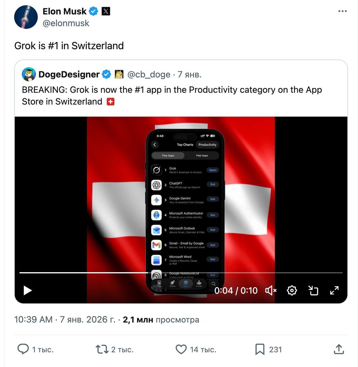 🏆 Grok обогнал ChatGPT по скачиваниям в швейцарском App Store
