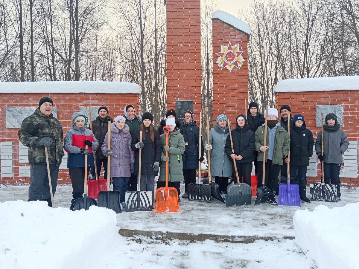 Бергә бердәм булып һәйкәл территориясен кардан чистарттылар.
