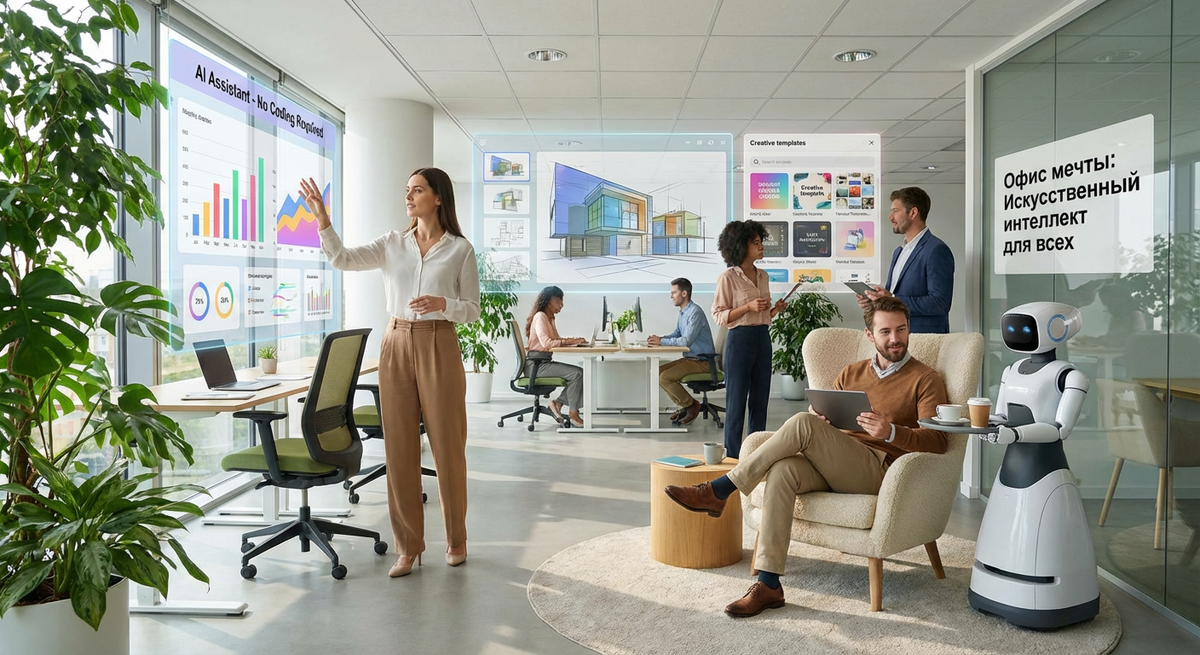 Дизайнер Антон больше не “ловит вдохновение” в понедельник утром — нейросеть выдаёт эскизы и фоны прямо во время встречи, а команда тут же голосует за лучший