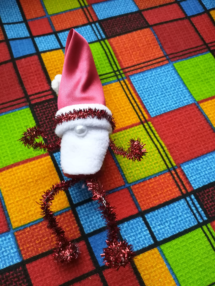 2. Из кусочка красного атласа делаем колпак. Применяет горячий клей.