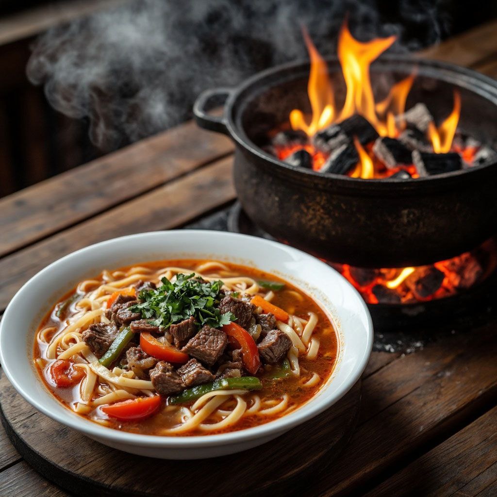 Что понадобится: говядина — 400 г; лапша — 300 г; помидоры — 300 г; болгарский перец — 140 г; лук — 1 шт.; морковь — 1 шт.; чеснок — 2 зубчика; соль — 1 ч. л.; перец — ½ ч. л.; зира — 1 ч. л.; масло — 3 ст. л.; вода — 1,2–1,5 л. Как готовить: Обжарьте говядину в казане до корочки. Добавьте лук, морковь, перец, помидоры — тушите 5–7 мин. Приправьте, влейте воду, доведите до кипения. Томите 20–25 мин, добавьте чеснок. Отдельно сварите лапшу. Подавайте: лапша + мясо с овощами + бульон. Почему вкусно: Сытное блюдо с насыщенным бульоном и ароматными специями — как из ресторана!