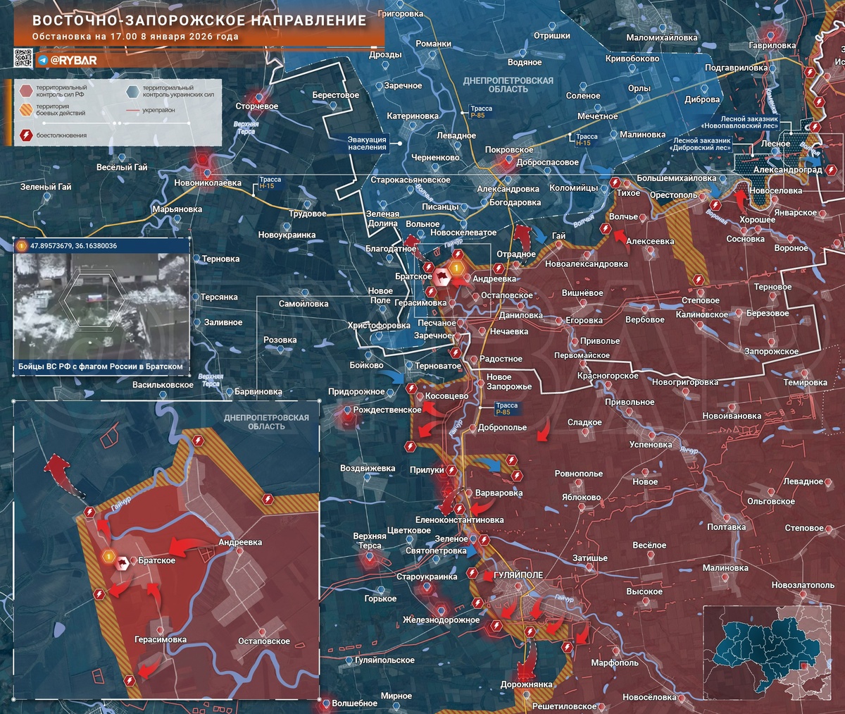 Пока в окрестностях Гуляйполя и западнее идут ожесточенные бои за контроль над опорными пунктами у Железнодорожного, на северном фланге бойцы группировки войск «Восток» освободили очередной населенный пункт. 🔸Бойцы 36 омсбр 29 армии форсировали в еще одном месте Гайчур и переправились на его левый берег. Этому также способствовала нелетная погода последние дни, что позволило штурмовикам перемещаться более свободно. Дальнейшее продвижение севернее Братского позволит сформировать «клешню» полуохвата Покровского с запада и перерезать одну из трасс снабжения. 🔸На центральном участке на рубеже Прилуки — Варваровка обстановка пока скрыта «туманом войны». После череды неудачных контратак ВСУ значительно снизили активность в окрестностях этих сел. Когда стало ясно, что к Ровнополью не прорваться, противник, по всей видимости, сместил акцент на проведение контратак с целью возвращения позиций под Гуляйполем. 📌 Истощив свой потенциал в постоянных контратаках в декабре, противник вновь оказалс