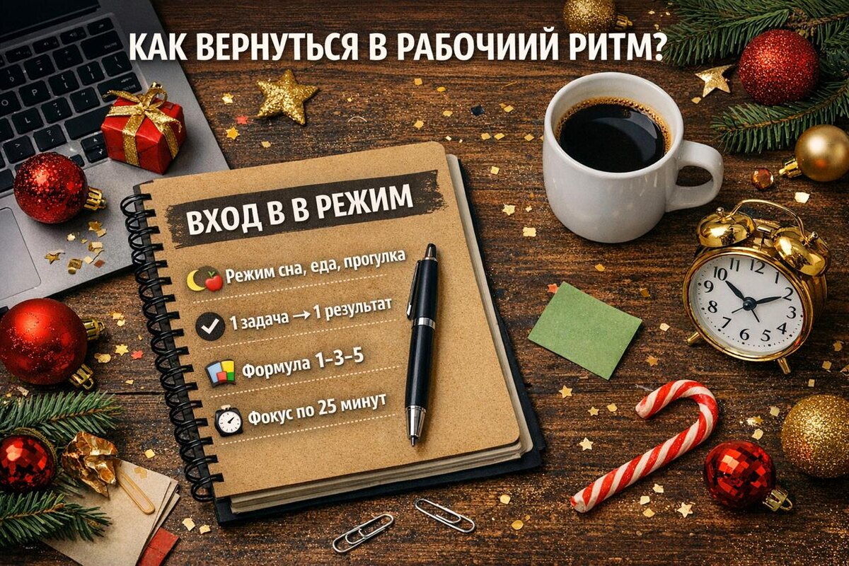 ) После новогодних праздников это состояние есть почти у всех. Мозг привык к быстрому дофамину — еда, алкоголь, сериалы, общение. А потом мы резко требуем от себя концентрацию, дисциплину и результат. Так не работает. Первые 2–3 дня — это не «я сломался», это разгон. Что реально помогает: 1. Не требовать от себя максимум Задача сейчас — войти в ритм, а не показать рекорд. Если пытаться сразу жить как в мае — будет только больше прокрастинации. 2. Вернуть базу, а не «мотивацию» Сон до полуночи. Кофе после еды. Прогулка без наушников. Минимум сладкого и алкоголя. Фокус чаще возвращается телом, а не мыслями. 3. Одна задача = один результат Не «поработать», а: — написать один пост — закрыть один вопрос — разобрать одну сделку Сделал одну ключевую вещь — день уже не пустой. 4. Формула дня 1–3–5 1 большая задача 3 средние 5 мелких Если сделал только одну большую — этого достаточно. 5. Короткие фокус-блоки 25 минут работы → 5 минут пауза. Телефон в другой комнате. Начать хотя бы с