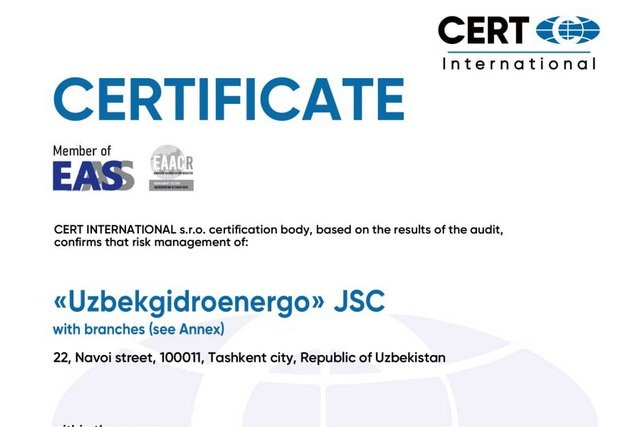 АО «Узбекгидроэнерго» впервые внедрило стандарты риск-менеджмента ISO 31000:2018 в управленческую практику