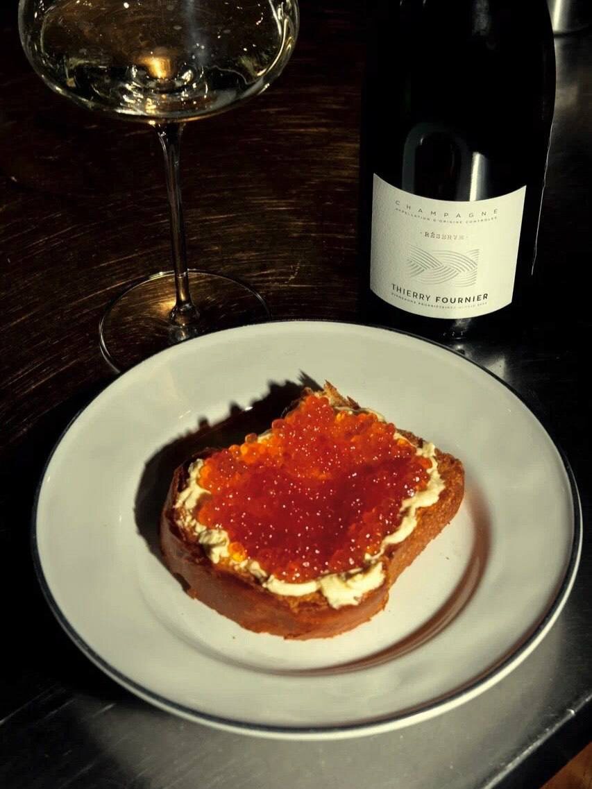 В Atelier Tapas&Bar до 11 января подают беспроигрышное праздничное комбо - бутерброд с красной икрой (890 ₽) и бокал шампанского Thierry Fournier (990 ₽).