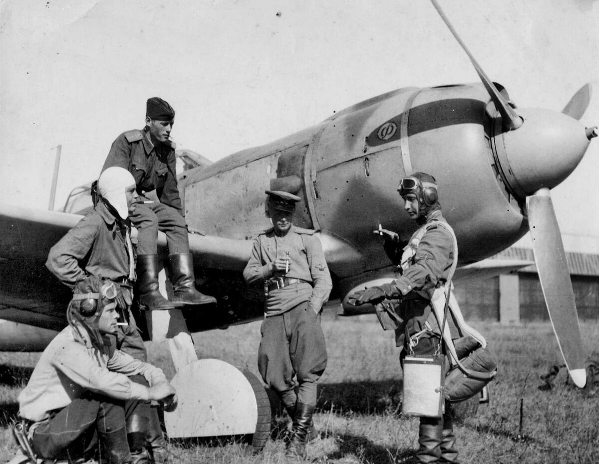 Перекур летчиков 848-го ИАП у истребителя Ла-5Ф на аэродроме Ямбол в Болгарии.