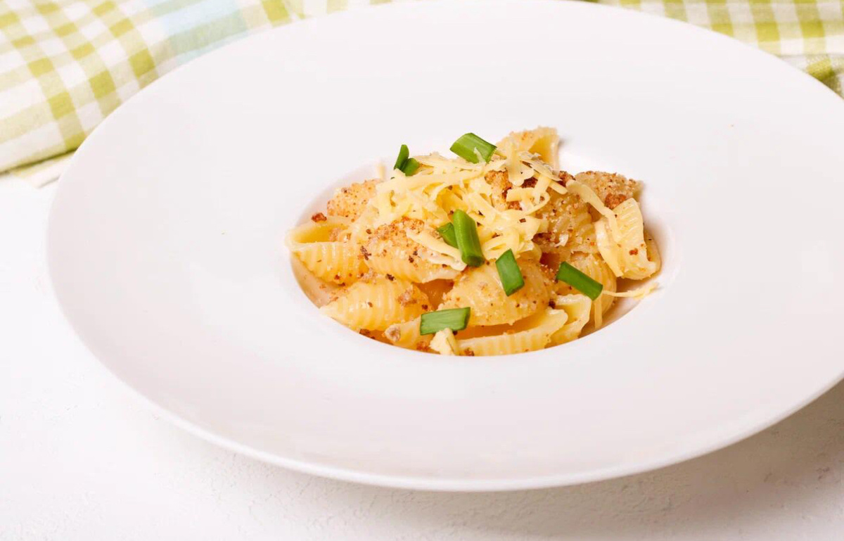 2. Пюрировать блендером. Добавить готовые макароны и сыр, соль, перец. Прогреть пару минут и подавать.