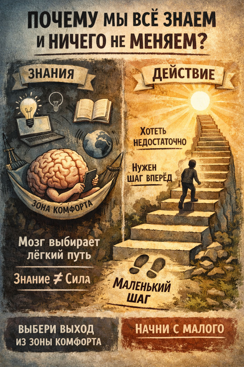 Потому что мозг выбирает путь наименьшего сопротивления. Знание - пассивно, оно не требует риска. Действие - это всегда выход из зоны комфорта, столкновение с неуверенностью, возможностью провала. Мы боимся, что «собранная» личность окажется неидеальной. Проще жить с «разрозненными кусочками Я», списывая всё на обстоятельства.
