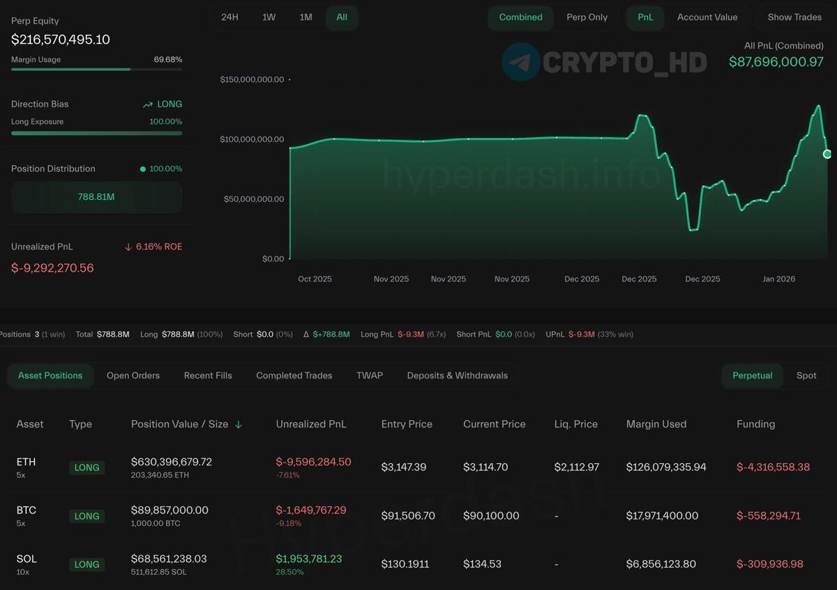 ). Текущие сделки: ▪По #ETH с 5x плечом на $630,400,000. Точка входа: $3147. Ликвидация: $2112. ▪По #BTC с 5x плечом на $90,000,000. Точка входа: $91,506. ▪По #SOL с 10x плечом на $68,500,000. Точка входа: $130,2 (кошелек) Ранее: плюс Crypto Headlines