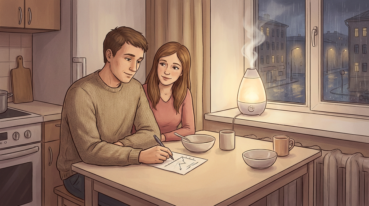 Утром она всё же распаковала увлажнитель, поставила на подоконник и включила. Тихий ровный шорох наполнил комнату, будто кто-то осторожно дышал. Это звучало почти как обещание: можно сделать воздух мягче, если перестать давить на него.