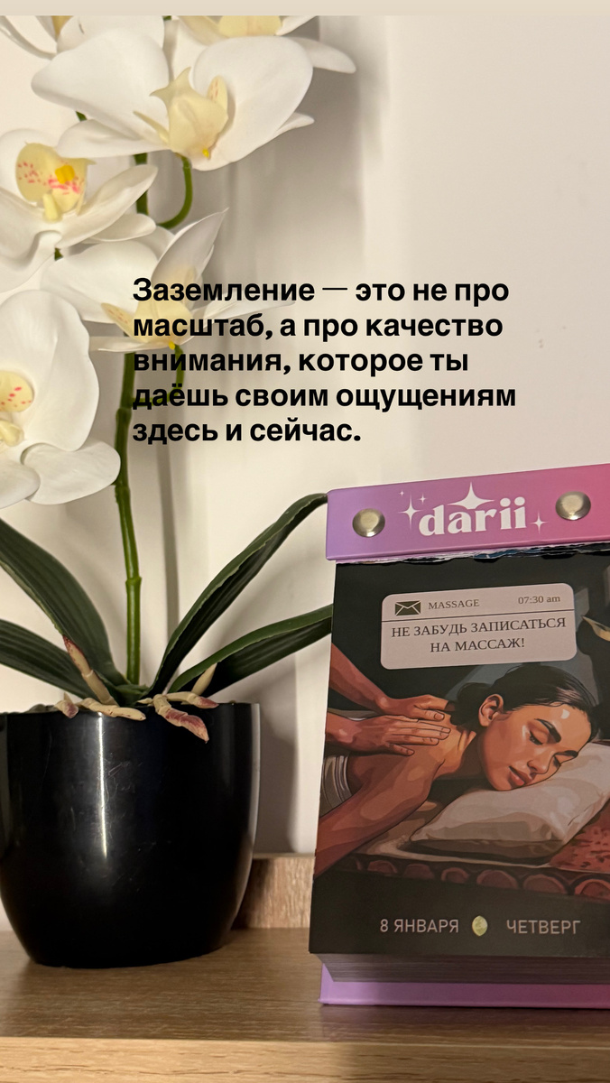 Заземление — это не про масштаб, а про качество внимания, которое вы даёте своим ощущениям здесь и сейчас.