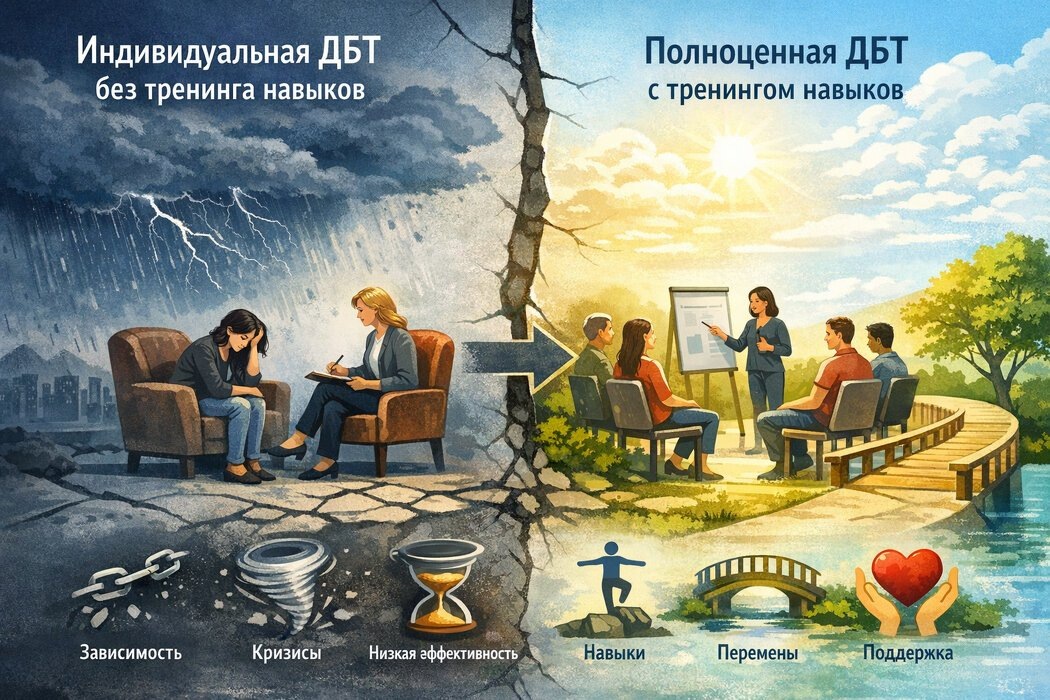 Индивидуальная терапия без тренинга навыков — это не полноценная ДБТ, а адаптированный или ограниченный формат.