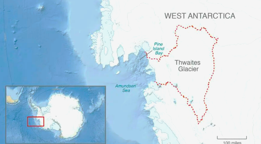 Что касается ледника Туэйтс, то его площадь составляет 192 тыс. кв км. и он буквально цепляется за побережье Антарктиды из последних сил.