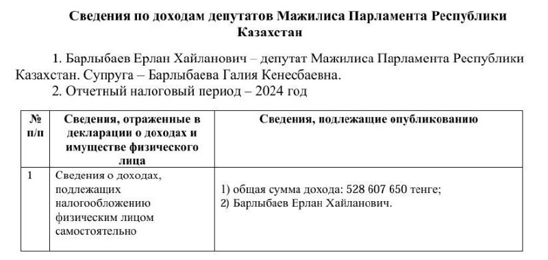 Супруга депутата Мажилиса задекларировала более полумиллиарда тенге дохода На сайте Мажилиса опубликовали декларации некоторых депутатов и их жён за 2024 год, передаёт Centralmedia24. 💬Согласно данным из деклараций о доходах, супруга председателя Мажилиса Ерлана Кошанова задекларировала общий доход за 2024 год в размере 1 577 425 тенге. 📌Депутат Мажилиса Альберт Рау также отчитался о доходах за 2024 год. Доходы его жены Светланы Рау составили 10 804 608 тенге. 📌Более высокий доход задекларировал депутат Бауржан Смагулов. Согласно декларации, доход его супруги за 2024 год составил 48 133 600 тенге. 📌Самый крупный доход среди опубликованных задекларировала жена депутата Ерлана Барлыбаева. Сумма за отчётный период составила 528 607 650 тенге. Скрин сайта mazhilis.parlam.kz Присылайте фото, видео и информацию анонимно — в наш бот t.me/CentralMedia24_KZbot или на WhatsApp +77080323818 😎Следите за новостями тут: https://dzen.ru/id/67fc8dffe608bc669477821e