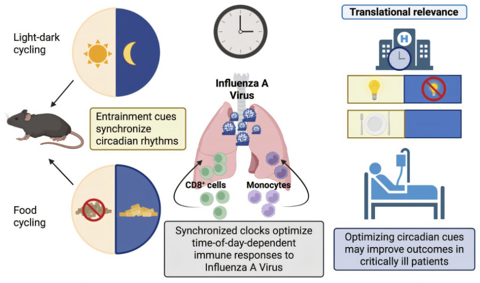 В одном из предыдущих материалов мы писали о том, как циркадные ритмы матери (или отца) влияли на восприимчивость потомства к бактериальной инфекции. Впрочем, результаты эти получены на весьма далеком от человека организме – нематоде С. Elegans. Однако другое исследование, проведенное учеными из Детской больницы Филадельфии (CHOP) уже на млекопитающих, дает прямые указания на то, что циркадные ритмы и их сохранение должны стать важным элементом в терапии инфекционных заболеваний. Работа опубликована в Journal of Clinical Investigation. Графическое представление исследования и его рекомендаций. Credit: Oindrila Paul et al / Journal of Clinical Investigation 2025 В работе, проведенной в 2019 году на мышах, ученые выяснили, что определенное время суток связано с лучшей защитой, например, от вируса гриппа. Доклинические исследования показали, что при заражении в дневное время организм лучше справляется с инфекцией. В новой работе авторы попытались стимулировать циркадные ритмы для того, ч