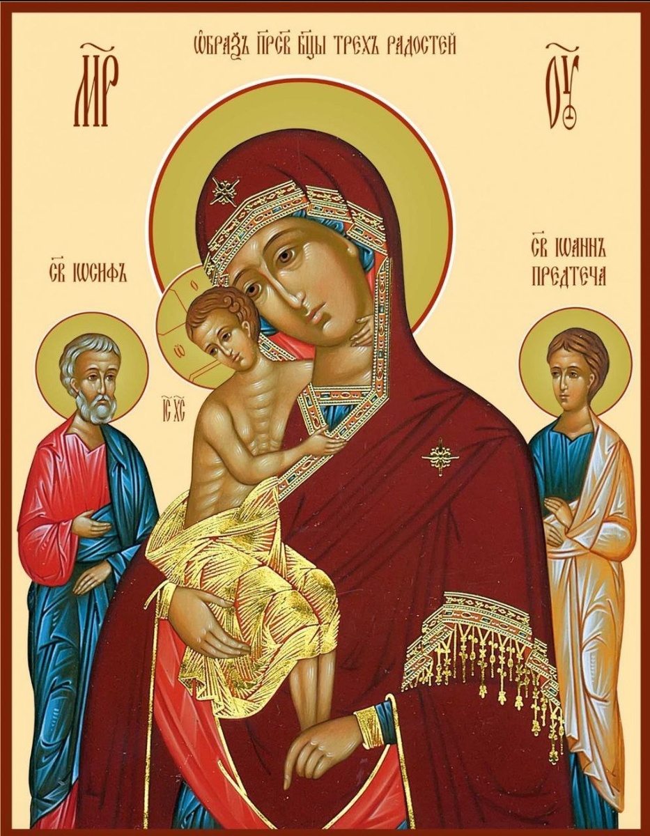 Предание гласит, что однажды на некую знатную женщину за короткий промежуток времени обрушилось сразу несколько несчастий — муж ее был оклеветан и отправлен в ссылку, имение отобрано в казну, а единственный любимый сын, опора и утешение несчастной женщины, во время войны попал в плен. Оказавшись в безвыходном положении, бедная женщина обратилась с горячей молитвой к Царице Небесной, прося Ее милостивого заступления. Владычица Небесная услышала слезные моления несчастной — однажды во сне женщина услышала голос, повелевающий ей отыскать икону Святого Семейства и помолиться перед ней. Долго искала скорбящая женщина образ по московским церквам и нашла его, наконец, на паперти Троицкой церкви на Покровке. Усердно помолившись Пресвятой Деве, она вскоре получила три радостных известия: муж ее был оправдан и возвращен из ссылки, сын освобожден из плена и имение возвращено из казны. Отсюда и пошло наименование иконы — «Трех Радостей»
