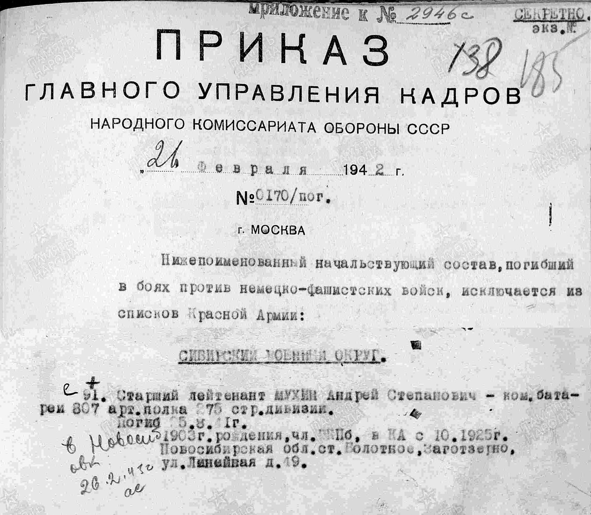 Секретно. Экз. №. Приложение к № 2946с Приказ Главного Управления кадров Народного Комиссариата Обороны СССР 24 февраля 1942 года № 0170/пог. Г. Москва. Нижепоименованный начальствующий состав, погибший в боях против немецко-фашистских войск, исключается из списков Красной Армии: … Сибирский военный округ. 91. Старший лейтенант Мухин Андрей Степанович – командир батареи 807 артиллерийского полка 275 стрелковой дивизии. Погиб 25.08.41г. 1903 года рождения, член ВКП(б), в Красной Армии с 10.1925 года. Новосибирская область, станция Болотное, Заготзерно, улица Линейная, дом 19. Заместитель начальника Главного Управления кадров НКО СССР Полковник Богданов Отпечатано в 4-х экз. Экз. № 1 -подлинный. Экз. № 2 -в округа. Экз. № 3 -в отдел учёта потерь. Экз. № 4 – в 8 отдел ГУК НКО. Исп. Голубов. Сл. 22.02.42г. Верно: Зав. делопр. 2 отделения Тех. интендант 2 ранга Смирнов. Источник: https://pamyat-naroda.ru/ Память народа.