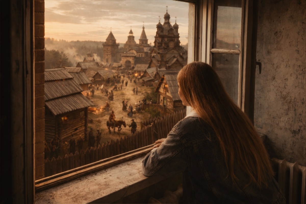 Глухой, протяжный, плывущий по воздуху. Катя подошла к окну и увидела деревянные стены, высокие частоколы и широкую реку, спокойно несущую свои воды. Над крышами поднимался дым, а вдалеке возвышались купола — простые, ещё не яркие, но уже величественные.