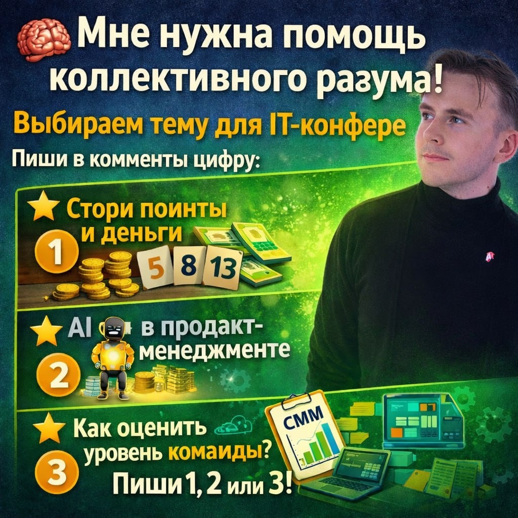 Короче, я поставил себе цель - хочу в этом году выступить спикером на it конференций. Это первый такой опыт. Хоть публичные выступления и не в новину, но вот подготовка к выступлению на конференции пока тёмный лес. И тут нужна помощь!🤓 Самое сложное выбрать тему, есть 3 на уме, хочу узнать, какая будет интереснее. Напиши в комменты цифру понравившегося тебе варианта! ⭐️ 1) Стори поинты на вес золота. Как история денег поможет в оценке задач Честно, сам выдумал. Смысл в том, что текущие фиатные деньги напоминают стори поинты. Фиат отражает объем производства, не привязан к какому либо вещественному товару и тд. На примере денег можно понять, как синхронизировать разные команды по оценке (также как стоимость рубля можно выразить в валюте Нигерии) и другое. ⭐️ 2) AI в работе продакта/проджекта. Ну тут чисто на хайпе. Покажу свои наработки в виде ботов и AI агентов, которые помогают в работе. Дам фундамент по которому можно определить, что нужно автоматизировать. ⭐️3) CMM. Как оце