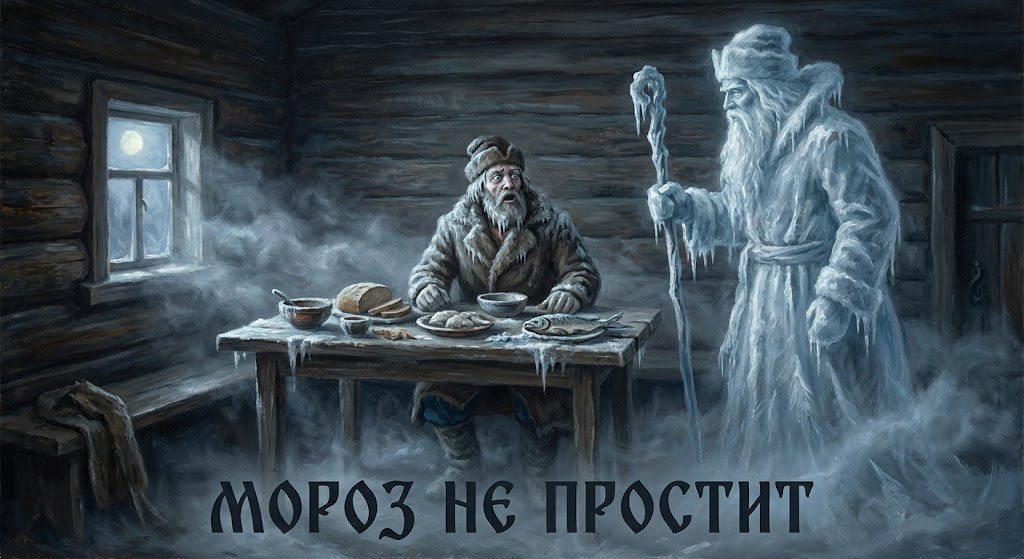 — **Все меня угостили,** — гудит Мороз, и каждое слово гвоздем в голову вбивается. — **Вдова Марья последнюю корку вынесла. Кузнец Вакула меду не пожалел. А ты, Игнат, богаче всех, а Мороза голодным оставил?**
