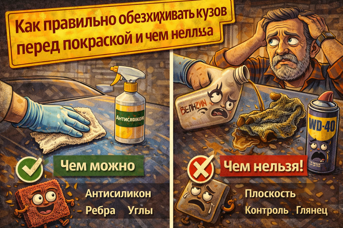 - Нельзя: бензин, солярка, уайт-спирит “на удачу”, ацетон и жёсткие растворители без головы, 646/647, WD-40 рядом с зоной покраски.