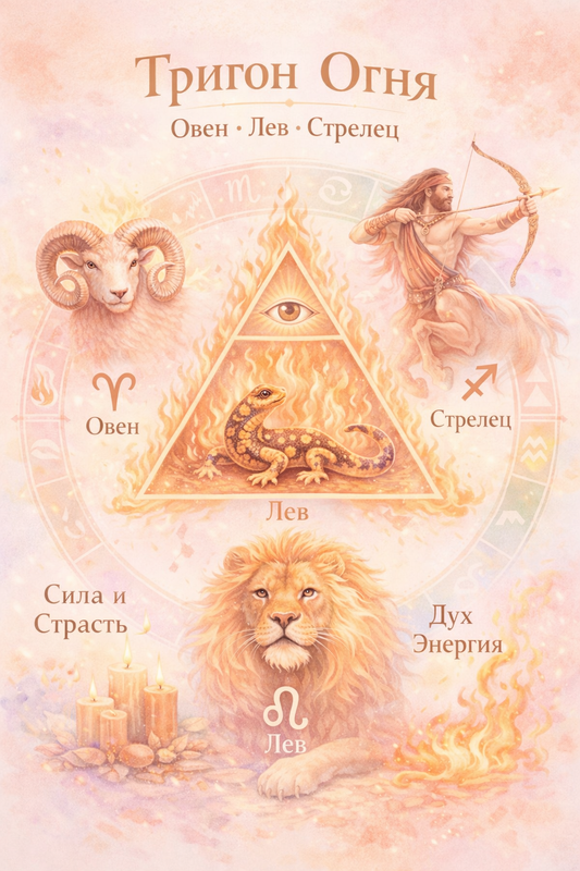 Четыре принципа, объединяясь попарно, образуют четыре стихийных элемента (четыре стихии), которые древние астрологи называли первоэлементами. Эти стихийные элементы являются неделимыми и непроницаемыми, сочетаются и движутся по определённым неизменным космическим законам. Стихии Огня и Воздуха считаются активными , а стихии Земли и Воды – пассивными . Если в гороскопе Асцендент, Солнце, Лупа или большинство планет находятся в активных знаках Зодиака, это будет человек действия, реформатор, революционер, способный достичь цели и преодолеть любые преграды. Если в гороскопе Асцендент, Солнце, Луна или большинство планет находятся в пассивных знаках Зодиака, то человек будет скорее исполнитель, чем руководитель. Хотя он и не даст миру новых идей, не станет реформатором или мучеником за идею, но результаты его трудов останутся в памяти благодарных потомков. Каждый стихийный элемент содержит три знака Зодиака, поэтому знаки одного стихийного элемента называются тригонами. К стихии Огня отн