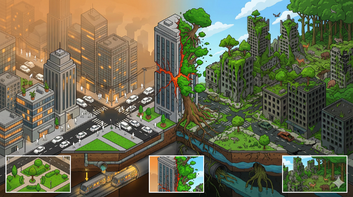 Звучит как очередная постапокалиптическая фантастика. Но современная наука превратила эти вопросы в строгие исследования с удивительно конкретными ответами. У нас есть реальные лаборатории — Чернобыльская зона отчуждения, Корейская демилитаризованная зона, заброшенные города от Припяти до Хашимы. Мы знаем, сколько времени нужно природе, чтобы поглотить небоскрёб (100-200 лет), как быстро восстанавливаются тропические леса (85% биомассы за 20 лет), и даже то, что пирамиды Гизы могут простоять миллионы лет, а Эйфелева башня — всего около тысячи.