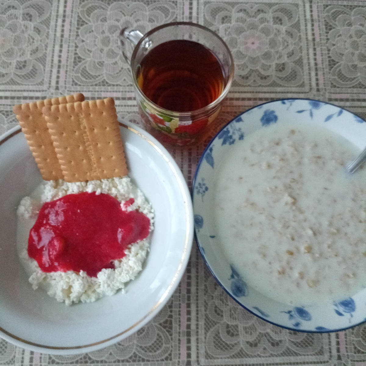 Полежала я так в кровати с телефоном, пока муж на кухне завтракал. Потом и моя очередь наступила готовить завтрак. Каши наварила много, осталось ещё на разок, завтра не варить, разогрею. Творог с клубничным пюре и чай с печеньем. Печенье мне на Новый год презентовала приятельница. Я такое сдобное не покупаю, но иногда позволить могу.