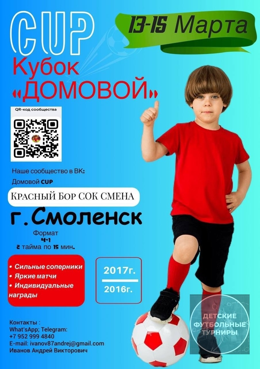 СМОЛЕНСК среди команд 2017гр. и 2016 г.р."Домовой Cup" 13-15 марта. Приглашаются команды для участия в турнире лига 2017 г.р. и лига 2016 г.р. 🥅Формат:4+1,два тайма по 15 минут,ворота(3 на 2). Проживание,питание,бассейн,сауна,матчи игр(все на территории комплекса). 🎉👍Успей заявить свою команду и принять участие в крутом турнире. Подробная информация: контакты на афише.☝☝☝ --- #ФутбольныйТурнирМарт2026 #ФутбольныйТурнирЦентральнаяРоссия2026 #ФутбольныйТурнирСмоленск2026 #ФутбольныйТурнирСмоленск2016гр #ФутбольныйТурнирСмоленск2017гр Источник: https://vk.com/wall-179468598_2313