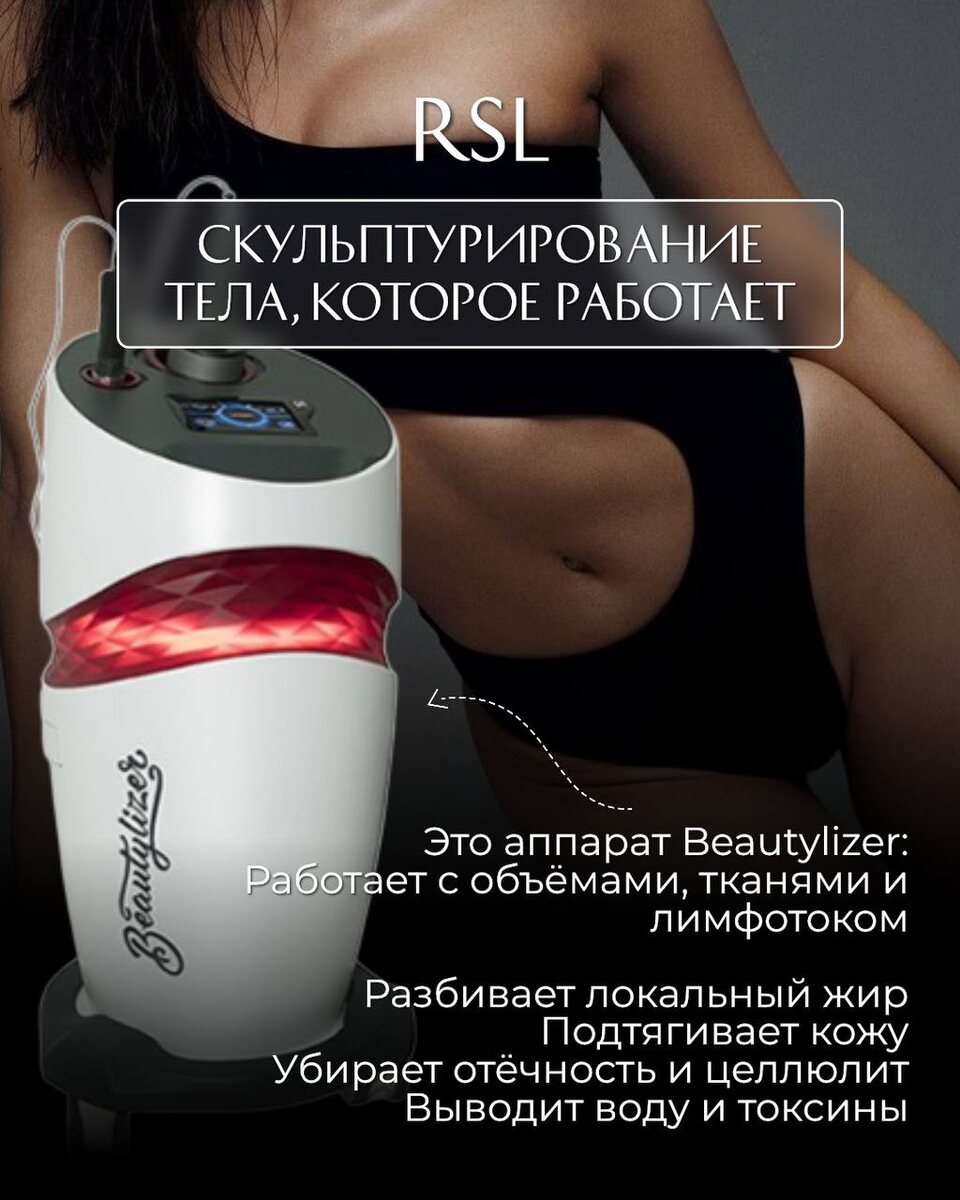 Есть зоны, которые не меняются ни после диет, ни после тренировок. Причина не в калориях, а в физиологии: 📍 локальные жировые отложения 📍 отёчность 📍 плотный фиброзный целлюлит 📍 неровный рельеф и рыхлость кожи Что делает RSL (аппарат Beautylizer): 🔸 разрушает локальные жировые скопления 🔸 активирует лимфоотток и кровообращение 🔸 уплотняет кожу и выравнивает рельеф Эффект проявляется комплексно, курсом процедур, для устойчивой трансформации тела. Преимущества курса RSL: — уменьшение объёмов — более плотная и гладкая кожа — улучшение контура тела — ощущение лёгкости и гармонии Это та процедура, которую я сама лично делаю регулярно и держу вес вот уже несколько лет без диет и ограничений! Попробуйте – легко записаться по ссылке в шапке профиля!