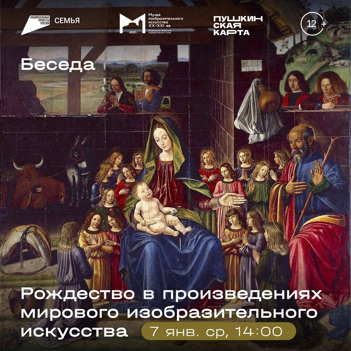 » 🗓️ 7 января, 14:00 📍Музей изобразительного искусства XX-XXI вв. Тема Рождества испокон веков была источником вдохновения для русских и западноевропейских художников. Рождество Христово – один из популярных и почитаемых евангельских сюжетов в мировом искусстве. В ходе беседы вы познакомитесь с произведениями иконописи и станковой живописи художников разных эпох и стран: Сандро Боттичели, Рафаэля Санти, Тициана Вечеллио, Рембрандта ван Рейна, Питера Пауля Рубенса, Джованни Тьеполо, Владимира Боровиковского, Алексея Корина, Бориса Кустодиева, Константина Коровина, Ильи Репина, Павла Филонова и других. Мы совершим путешествие в мир красок и линий, с помощью которых мастера донесли до современного человека красоту и радость Рождества Христова. Билеты 🎟️ #7января26@culturnik