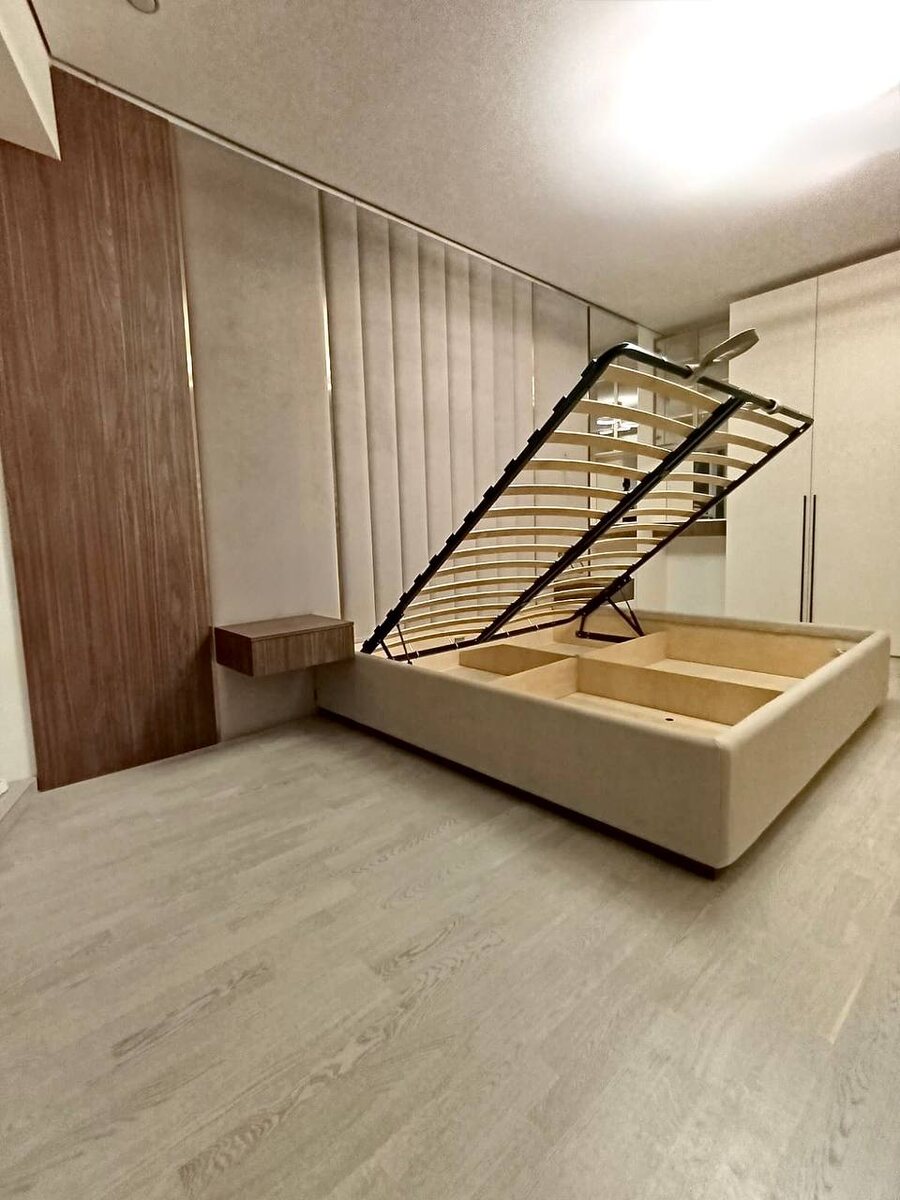 Центральным элементом стала большая кровать по индивидуальному заказу размером 200×200 см. Корпус выполнен из нашего запатентованного материала Лакфанера. Это фанера 15 мм, которую мы сами шлифуем и покрываем итальянским лаком. Такой корпус прочный, долговечный и влагостойкий. Цоколь кровати обрамлён ЛДСП Egger 18 мм в оттенке орех Линкольн. Для удобства предусмотрена ортопедическая решётка с подъёмным механизмом, а съёмный чехол из антивандального велюра делает уход простым и практичным. Стены украшены зеркалом и мягкими панелями с молдингами на всю высоту, создающими атмосферу уюта и завершённости. В комплекте — тумбы, выполненные из того же материала, что и обвязка кровати, чтобы сохранить гармонию и единый стиль интерьера. Для консультации, ставьте + в комментариях