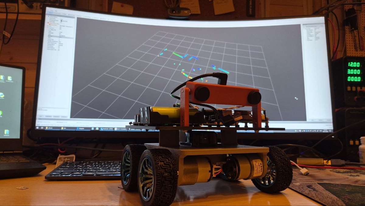 🔍🤖 Для этого пришлось спроектировать отдельную деталь с тонкими стойками, на которых держится верхний уровень конструкции 🧩 Задача была не просто «опустить лидар пониже», а сделать это минимально заметно для обзора и максимально аккуратно конструктивно. Через одну из стоек от нижнего уровня вверх проходит жгут проводов 🔌 — без лишних петель и внешних кабелей. В результате лидар расположен достаточно низко, не перекрывается корпусом и даёт практически полный 360° обзор 🌍 (пара градусов с боков и сзади — не в счёт 😉) Едем дальше 🚀