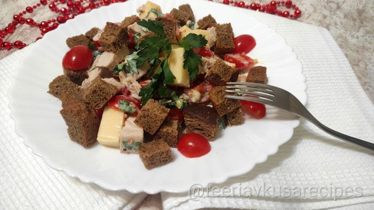 Салат "Баварский" - низкокалорийный рецепт для правильного питания, который можно приготовить всего за 5 минут, при условии если заранее отварить мясо. Калорийность приблизительно 126 Ккал на 100 гр. Салат без колбасы и майонеза. Инструменты и посуда: нож, доска, миска, пресс для чеснока, кастрюля. Кусок черного бородинского хлеба нарезаю на кусочки и подсушиваю в духовке около 10 минут при 180 градусах, периодически помешивая. Сыр нарезаю кубиками. У меня сыр голландский, но можно брать и российский. Помидоры черри нарезаю половинками. Их понадобится совсем немного, поэтому сильно по карману рецепт не ударит. Петрушку мелко рублю, выдавливаю чеснок через пресс и заправляю сметаной, смешанной с соевым соусом и зернистой горчицей. Подсаливаю по вкусу. Какие салаты любите на правильном питании? Если любите вкусные и простые рецепты, подписывайтесь, ставьте палец вверх и делитесь с друзьями, буду рада видеть у себя) Также можете поддержать донатом! Деньги пойдут на покупку ноутбука для